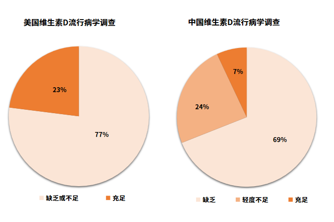 據(jù)統(tǒng)計,美國維生素D缺乏或不足人群超過總?cè)巳旱?0%;中國維生素D輕度不足人群占24%,而維生素D缺乏人群高達69%,且發(fā)病人群年齡、性別、區(qū)域和季節(jié)性存在差異化特點,在妊娠期婦女、兒童、青少年及老年人表現(xiàn)尤為嚴重。