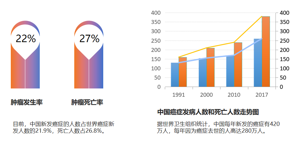 2020年中國新發(fā)癌癥病例457萬例,癌癥死亡病例300萬例。新發(fā)癌癥人數(shù)、癌癥死亡人數(shù)均位居全球第一?!督】抵袊?030規(guī)劃綱要》中提出總體癌癥5年生存率提高15%的目標(biāo)。